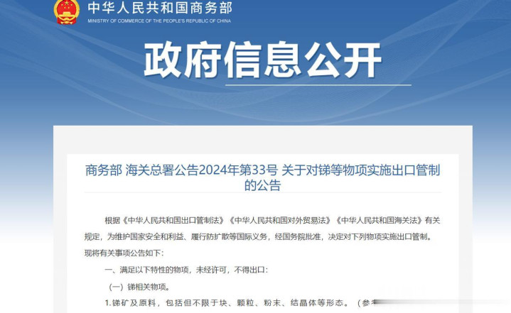 直到2024年8月,中国商务部把锑及相关化合物纳入出口管制清单,后续还明确禁止对美出口,这一下直接戳中了美国的痛点。